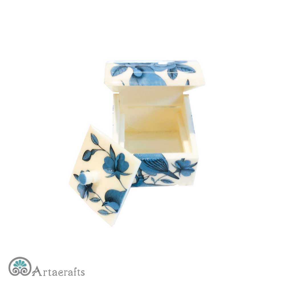 This jewelry box is made of camel bone with miniature painting of flower & bird. It is handmade.